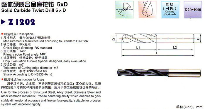整體硬質(zhì)合金麻花鉆5xD說明: